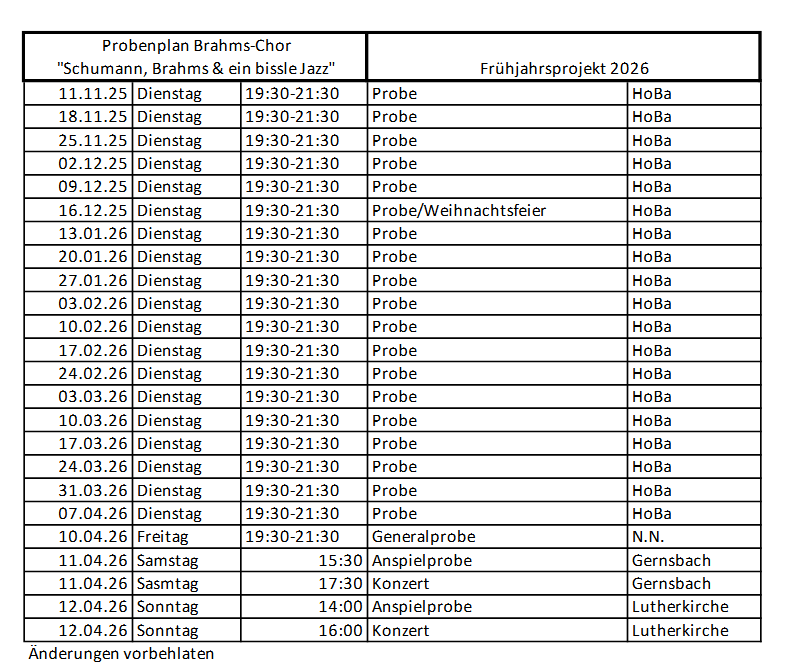 Unsere Proben finden, sofern nicht anders angegeben, jeweils dienstags um 19:30 Uhr im Gymnasium Hohenbaden, Leo-Wohleb-Weg 1, statt. Wir freuen uns sehr über Neuzugänge in allen Stimmlagen. Kommen Sie einfach dazu!
